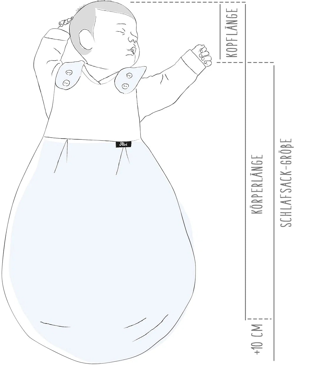 Körperlänge - Kopflänge + 10 cm= Richtwert Schlafsack-GrößeWichtig:Diese Formel gilt ausschließlich für das Baby-Mäxchen.