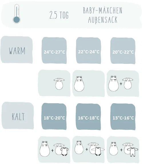 Flexible Kombination von Außen- und Innensack und weiterer Schlafbekleidung (Body, Pyjama & Co.) ermöglicht eine Anpassung an fast jede Zimmertemperatur. Unsere Außensäcke gibt es zudem mit unterschiedlichen TOG-Werten (2,0 | 2,5 | 3,5).