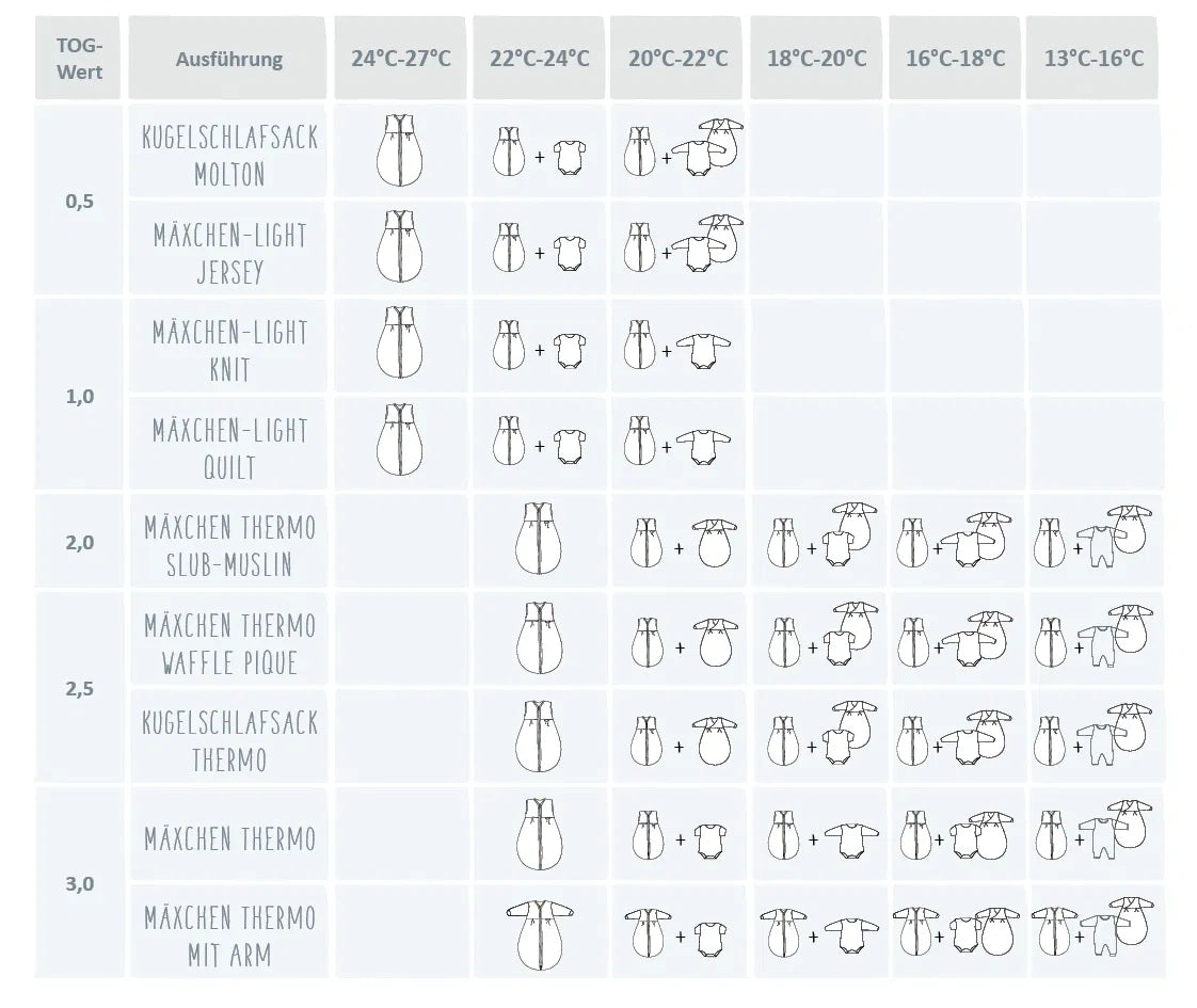 TOG-Werte geben an, wie viel Wärme ein Schlafsack speichert, und helfen dir, die richtige Kleidung für dein Baby auszuwählen. Ein höherer TOG-Wert bedeutet, dass der Schlafsack mehr Wärme bietet, während ein niedrigerer TOG-Wert für kühlere Temperaturen geeignet ist.
