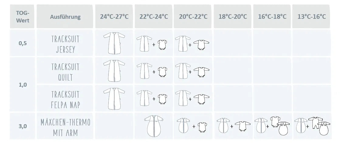Unsere TOG-Wert-Tabelle kann dir eine hilfreiche Orientierung bieten, welche Kleidung gut zu dem Schlafsack und der Zimmertemperatur deines Babys passt.