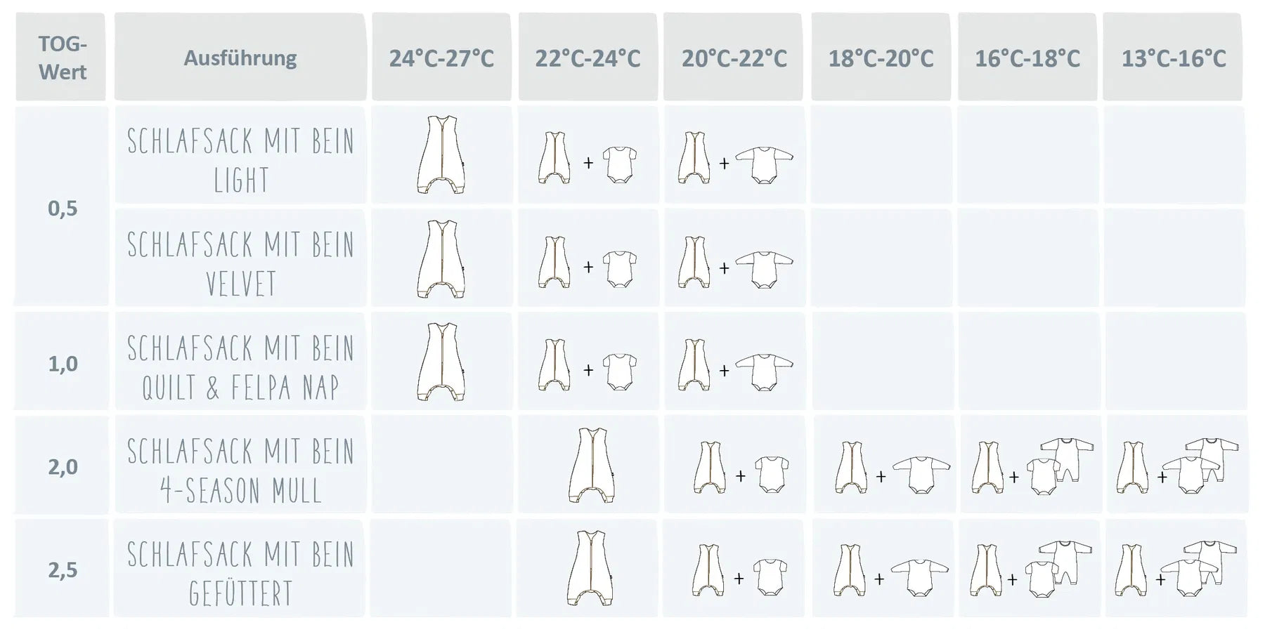 Welche Größe dein Kind braucht und wie du den Schlafsack bei verschiedenen Raumtemperaturen kombinieren kannst, erfährst du hier.